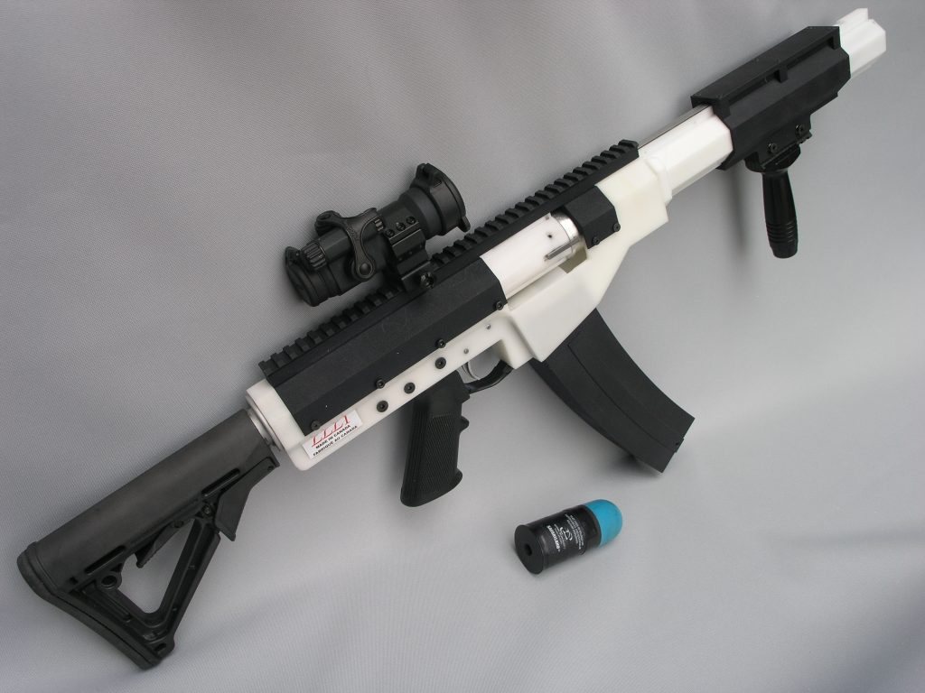The Lamperd Less Lethal 50Cal. Upper. The Upper fits your AR/15 and combines the rugged reliability of the AR/15 rifle with LLLI’s new less lethal synthetic round technology. This unit converts in seconds, and is a new weapon system that is ideal for public order situations. Performance is exceptional at 500 ft. per second (340.9 mph, 548.6 km/h) and is effective to 100 feet!
